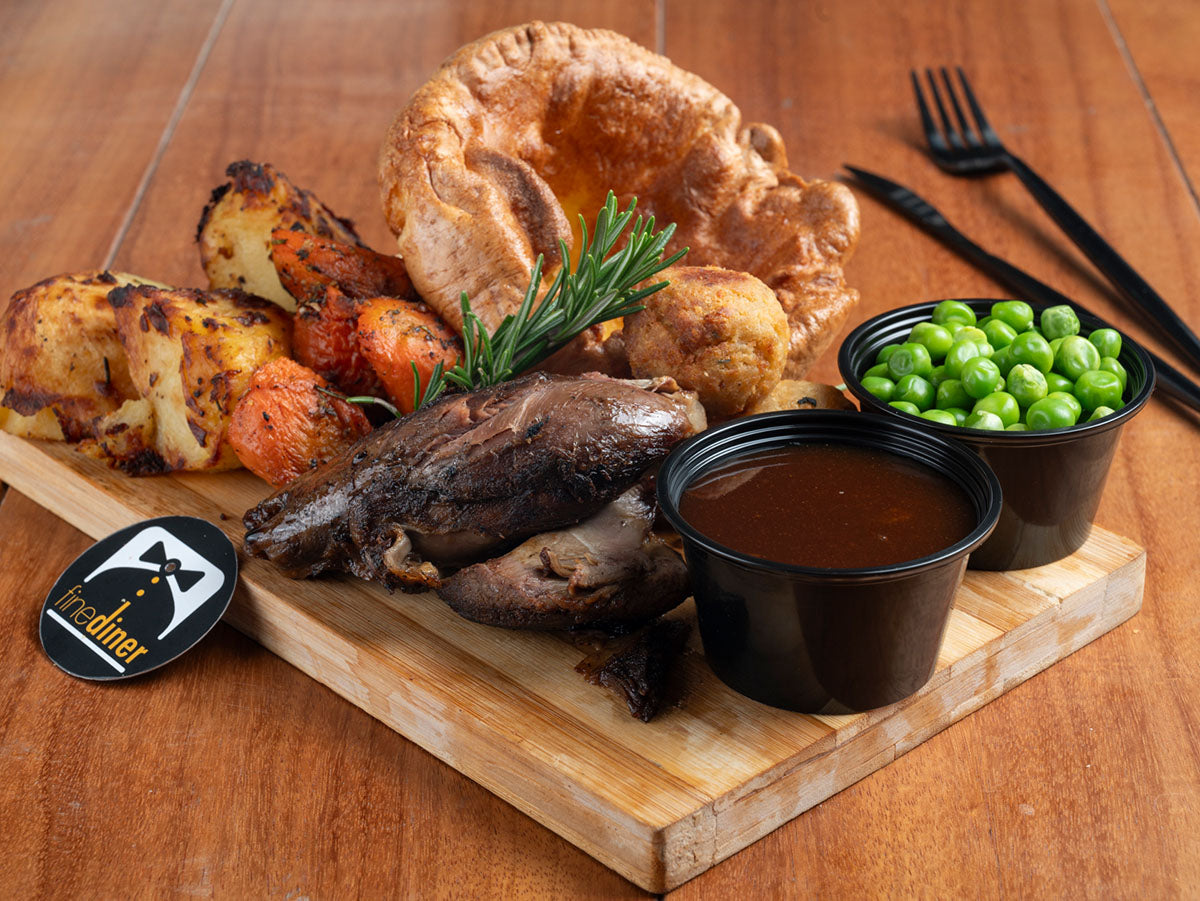 Slow-cooked Lamb Shank, 180g of perfectly roasted potatoes, 150g of tender carrots, 4 pieces of scrumptious stuffing, 2 Yorkshire puddings, and hearty gravy. The ultimate roast dinner experience, perfect for a hearty appetite.
