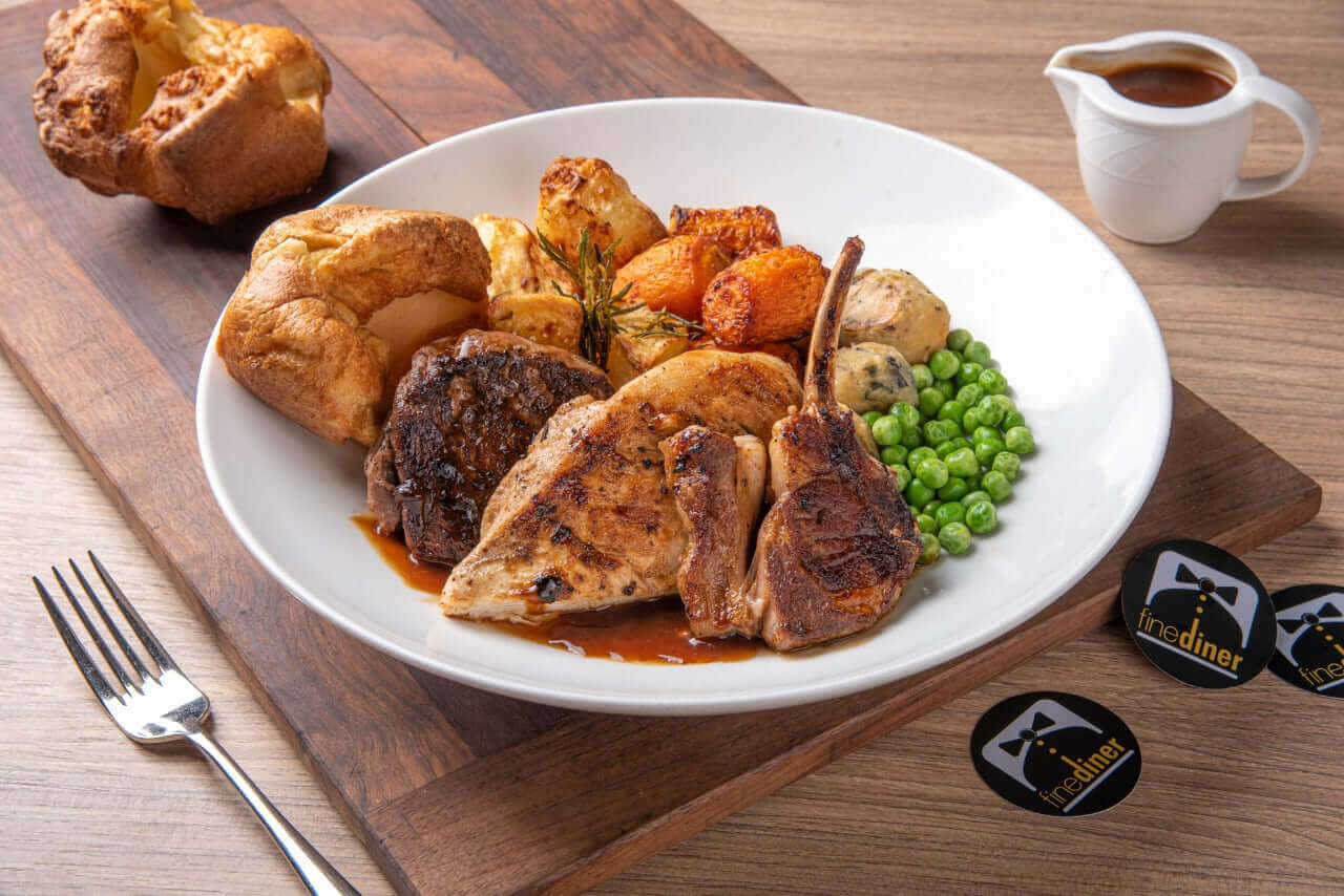 A premium cut of juicy beef tenderloin (125g), Marinated Chicken Breast (125g) and Lamb Chop cooked to perfection. Each roast dinner comes served with our freshly baked Yorkshire pudding (x2), stuffi
