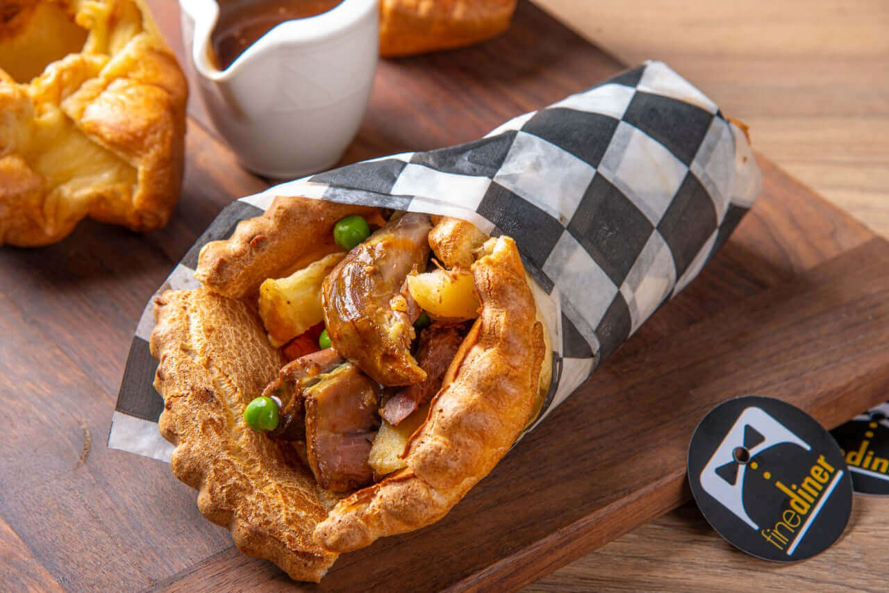A large Yorkshire Pudding Wrap packed with lamb, roasted carrots, roasted potatoes, green peas, stuffing and gravy. served with extra gravy on the side.